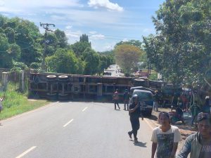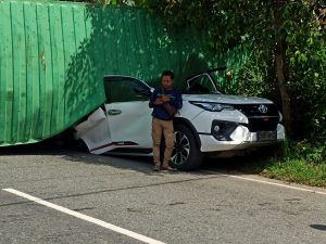 WARTABANJAR.COM, BANJARBARU – Mobil Toyota Fortuner ringsek tertindih kontainer, Senin (18/10/2021) siang.