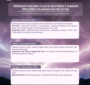 WARTABANJAR.COM, BANJARBARU – Peringatan dini cuaca wilayah Kalimantan Selatan (Kalsel) dikeluarkan Badan