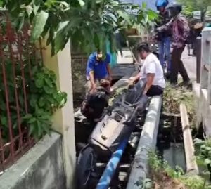 WARTABANJAR.COM, BANJARMASIN – Dua pengendara sepeda motor tercebur di Jalan Manggis, Kelurahan