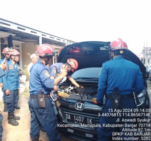 WARTABANJAR.COM, MARTAPURA – Seekor anak kucing terperangkap di kap mesin mobil hingga