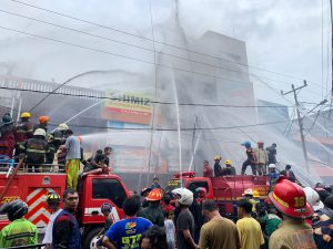 WARTABANJAR.COM, BANJARMASIN- Upaya pemadaman kebakaran di kawasan pertokoan di Jalan Pasar Baru,