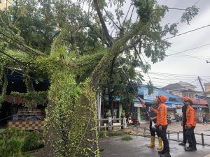 WARTABANJAR.COM, BANJARMASIN – Hujan dengan disertai angin deras, diduga mengakibatkan sebuah pohon