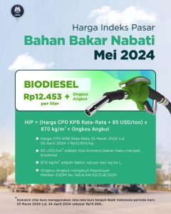 Kementrian ESDM Tetapkan Harga BBN Biodiesel Mei ini Rp 12.453Berita, Nasional|Rabu, 1 Mei 2024 - 19:38 WIBRabu, 1 Mei 2024 - 19:47 WIBoleh RestuWARTABANJAR.COM – Harga Indeks Pasar (HIP) Bahan Bakar Nabati (BBN) jenis Biodiesel