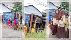 WARTABANJAR.COM, BANJARMASIN – Sebuah truk kontainer dilaporkan terbalik di dekat Jembatan Mantuil,