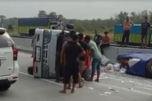 WARTABANJAR.COM – Mikrobus terguling di jalan tol Lampung. Akibatnya, 10 penumpang mikrobus
