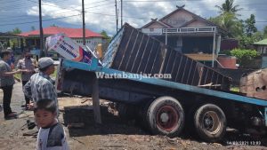 WARTABANJAR.COM, BANJARBARU– Satu unit truk tronton menabrak sebuah warung di daerah Liang