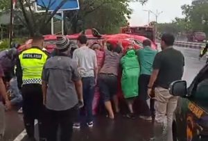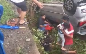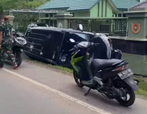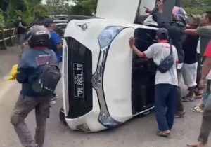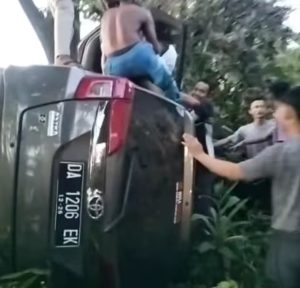 WARTABANJAR.COM, MARTAPURA- Sebuah mobil minibus terbalik di Jalan Bypass Mataraman, Kecamatan Sungai