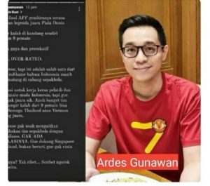 Presenter TV Ardes Goenawan Banjir Hujatan Setelah Remehkan Timnas dan Doakan KalahSport|Senin, 27 Desember 2021 - 11:12 WIBSenin, 27 Desember 2021 - 11:12 WIBoleh Ernawati DjediWARTABANJAR.COM – Presenter Ardes Goenawan mendadak jadi serbuan hujatan netizen karena dinilai