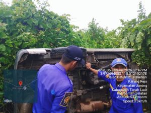 WARTABANJAR.COM, PELAIHARI – Sebuah mobil jenis minibus mengalami kecelakaan tunggal hingga terbalik