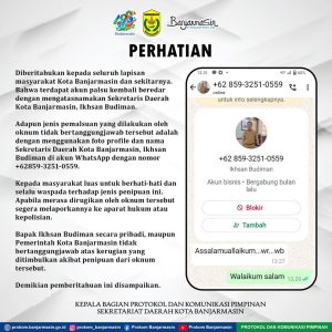 WARTABANJAR.COM, BANJARMASIN – Pemko Banjarmasin mengumumkan ada nomor WhatsApp yang mengatasnamakan Sekretaris