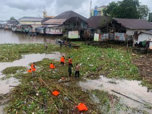 WARTABANJAR.COM, BANJARMASIN – Eceng gondok kembali menumpuk di Sungai Martapura, tepatnya di