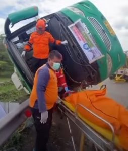 WARTABANJAR.COM – Tim SAR Gabungan mengevakuasi penumpang bus parivwisata yang terguling di